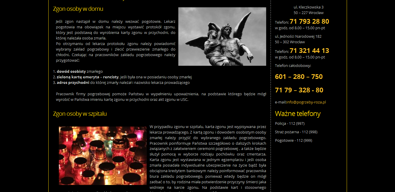 Strona wizytówka przygotowana przez nas dla Zakładu Pogrzebowego - Pogrzeby Róża, mieszczącego się i działającego na terenie Wrocławia. Poza standardowymi zakładkami ofertowymi wyposażyliśmy witrynę w uproszczoną funkcję sklepu, za pomocą której można dokonać zakupów wieńców online.